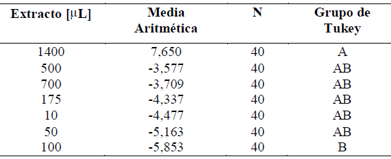 En las dosificaciones de solución acuosa utilizadas, la prueba de medias de Tukey demostró que el mayor efecto hipoglicemiante ocurrió para la dosis de 1,4 g/dL, aun cuando en general se observa un incremento en el consumo de glucosa a partir de la dosis 0,175 g/dL, los valores negativos indican que las dosificaciones de la solución acuosa de las plantas fueron en promedio mayores a las del control, estos promedios fueron calculados para las dos plantas en todos los instantes considerados (Tabla 4).