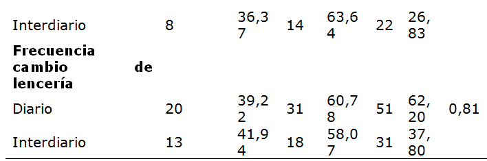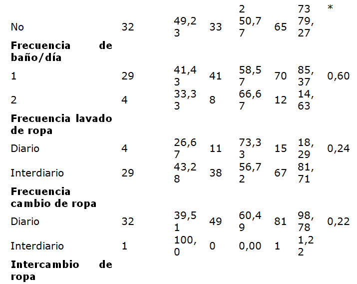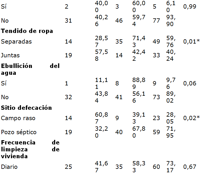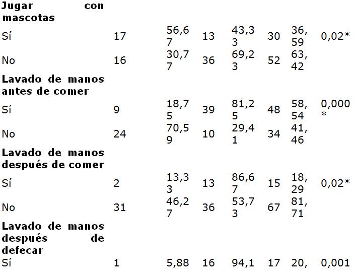 En la Tabla 2, se muestran los signos y síntomas. El prurito anal se presentó en 22 (66,67%) de los niños parasitados y 15 (30, 61%) de los no parasitados (χ2 = 10,32; OR = 3,6; p = 0,001); la intranquilidad se detectó en 15 (45,46%) de los niños parasitados y 7 (14,29%) de los no parasitados (χ2 = 9,6; OR = 5; p = 0,001); mientras que el bruxismo se presentó en 20 (60,61%) de los niños parasitados y 10 (20,41%) de los no parasitados (χ2 = 13,6; OR = 6; p = 0,001), y el dolor abdominal en 8 (24,24%) de los niños parasitados y 3 (6,12%) delos no parasitados (χ2 = 5,5; OR = 4,9; p = 0,001) (Tabla 2). Dentro de los hábitos de higiene personal y familiar (Tablas 3 y 4) se encontraron significativamente asociados a oxiuriasis, la onicofagia (χ2 = 4,6; p = 0,03), uñas sucias (χ2 = 16,8; p = 0,001), jugar con mascotas (χ2 = 5,2; p = 0,02), no lavar las manos antes (χ2 = 22,0; p = 0,000) y después (χ2 = 5,5; p = 0,02) de comer y al defecar (χ2 = 10,4; p = 0,001), colgar la ropas juntas (χ2 = 6,8; p = 0,01), defecar en pozo séptico (χ2 = 5,6; p = 0,02), recolectar la basura en bolsas plásticas (χ2 = 13,9; p = 0,000), el hacinamiento (≥ 6 personas/casa: χ2 = 30,4; p = 0,000); ≥ 3personas/habitación: χ2 = 5,2; p = 0,02); y en lo referente a las condiciones socio-económicas (Graffar), pertenecer a un núcleo familiar con un bajo nivel de pobreza relativa o crítica (χ2 = 12,0; p = 0,001) (Tabla 4).