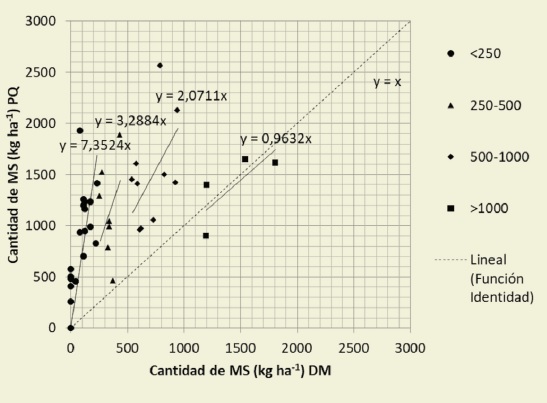 Según las clases definidas, la pendiente de la función lineal de ajuste es mayor mientras menor es el rango de clase. Esto significa que en relación al método DM como referencia, los valores de PQ sobreestiman los Valores Pastorales y, por ende, la cantidad de biomasa forrajera.