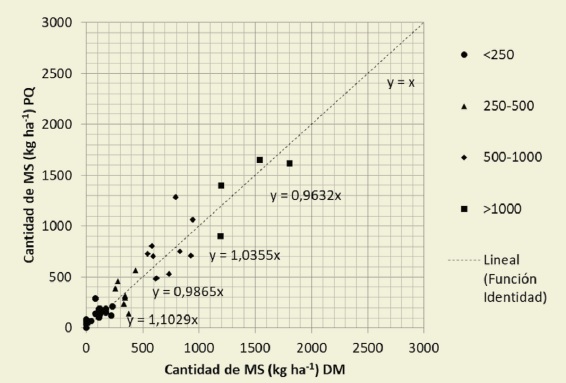 Todas las determinaciones se transformaron a valores de kg de MS ha-1, determinando pares de valores de cada transecta correspondientes a los obtenidos por cada método (PQ, DM). Dichos pares fueron agrupados según clases de acuerdo a los valores de DM, ajustando funciones de regresión lineal en cada una, con ordenada al origen en (0, 0), que permitieron aplicar posteriormente factores de ajuste en relación a una función identidad (y = x). Los análisis estadísticos fueron efectuados con el programa estadístico InfoStat (Di Rienzo et al., 2019).