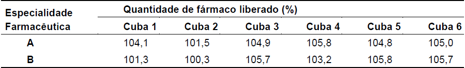 Foi avaliada, nas especialidades farmacêuticas A e B em estudo, a quantidade de ACV dissolvido no meio de dissolução após tempo e rotação preconizados pela Farmacopeia Brasileira, 5ª Ed. (45 minutos a 50 rpm). A quantidade de fármaco dissolvida em cada cuba está representada na Tabela 1.