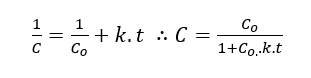 The discoloration was evaluated using the photo-Fenton process (UV/H2O2/Fe+2) by kinetic models. The order of the reaction is the dependence of the speed of the reaction with the concentration. With C0 being the initial concentration of the reagent, and C the concentration of the reagent elapsed at time t of reaction and n the order of the reaction. When n = 1 the reaction is of pseudo-first order (Equation 1) and n = 2 of pseudo-second order (Equation 2).