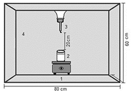 The experiments with the synthetic effluent were carried out in a laboratory-scale reactor, operating in a batch system, consisting of a beaker with 250 mL of capacity and a magnetic stirrer to homogenize the solution, positioned inside a wooden box (80 cm x 40 cm x 60 cm) coated with aluminum foil to increase the radiation incidence in the solution and equipped with a UV source (high pressure Mercury vapor lamp without the bulb – 250W) fixed at the top about 20 cm from the solution. The inner temperature, after 20 min, was maintained at about 45 °C (Figure 1).