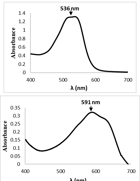 In order to determine the amount of dye removed, the optimum wavelength definition for the red 4B and blue 5G dyes reagent was first determined. This definition was obtained by double beam spectrophotometer scanning, where the molecular absorption spectrum was obtained, indicating the maximum absorbance band at 536 nm for red 4B dye and at 591 nm for blue 5G dye (Figure 2).