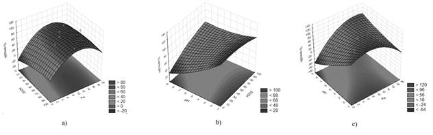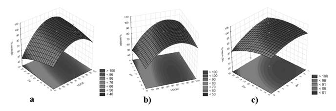 The Figure 3 shows the behavior of the process regarding the discoloration efficiency of red 4B according to the relation of the dependent variables by the surface response graph.