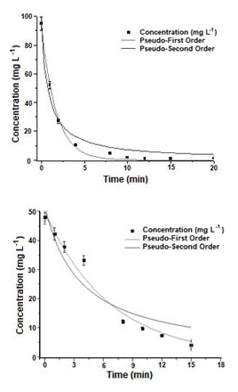 The optimum conditions were used in the kinetic study for both dyes. The pseudo-first order and pseudo-second order models fitted to the experimental data are shown in Figure 5.