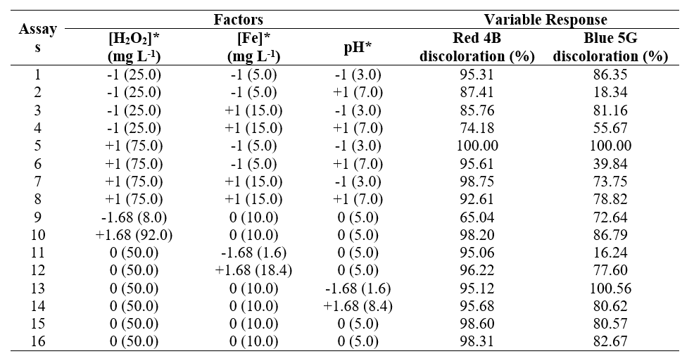 The experimental matrix for the 2³ central composite rotational design (CCRD) delineation is presented in Table 1, with the levels of each factor, the actual values and the response variable obtained for the discoloration of red 4B and blue 5G dye in the photo-Fenton process (UV/H2O2/Fe+2) in the course of 16 runs performed randomly.