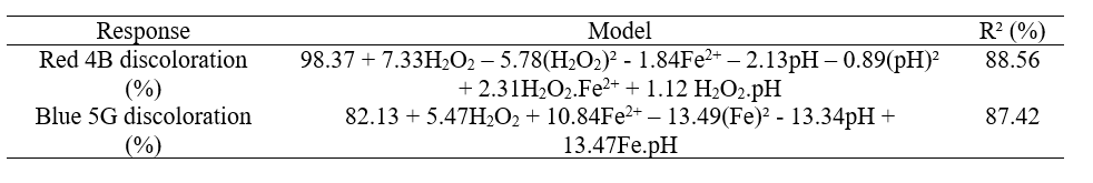 For the discoloration of the red 4B and blue 5G dyes respectively the R² values show that 88.56 % and 87.42 % of the responses were explained by the models, and the linear effects of pH and concentrations of [H2O2] (mg L-1) and [Fe2+] (mg L-1) were the most important to describe the behavior of discoloration of the analytes by the photo-Fenton process.