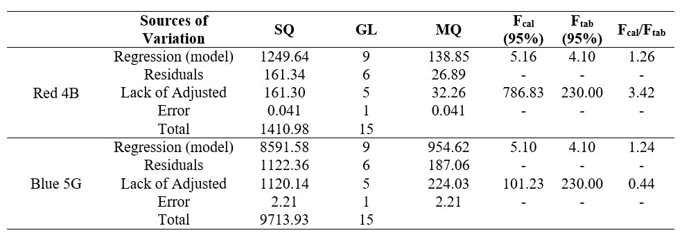 It is observed in Table 3 that the ratio of Fcal to Ftab for the regression presented a statistically significant value for the equation of discoloration of both dyes, a fact evidenced by a value higher than 1. Moreover, for the blue 5G dye, it was not observed (Figure 2). In this study, the Fcal/Ftab ratio for the lack of fit was lower than 15.