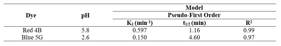 Half-life times of 1.16 min for red 4B and 4.60 min for blue 5G dyes were observed. It was also verified that there was a greater speed of dye discoloration in the pseudo-first order model, besides a better adjustment in both treatments.