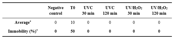 It was observed in both treatments that there was no immobility for A. aegypti (Table 1), inferring that the degradation of Malathion 500 CE was efficient, losing its larvicidal property, besides that; the byproducts generated were not toxic to the organisms17.