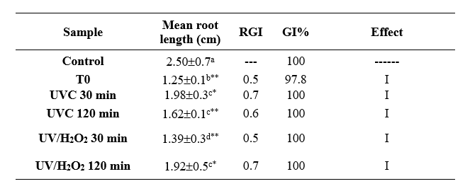 It can be verified that the treatments showed an efficiency in reduction of effects on root growth of lettuce seedlings in comparison to pre-treatment sample (T0 = 550 μg L-1, with RGI = 0.50), since after UVC and UV/H2O2 processes all samples had RGI higher than 0.50.