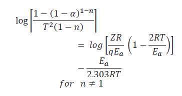where: α = fraction of weight loss, T = temperature (K), Z = pre-exponential factor, R = molar gas constant, q = heating rate and n = reaction order estimated by Horovitz-Metzger method.