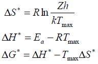 The thermodynamic parameters of the thermal degradation step: enthalpy (ΔH*), entropy (ΔS*), and Gibbs energy (ΔG*) of activation are calculated using the following standard equations: