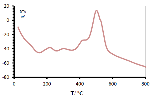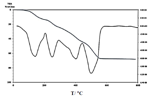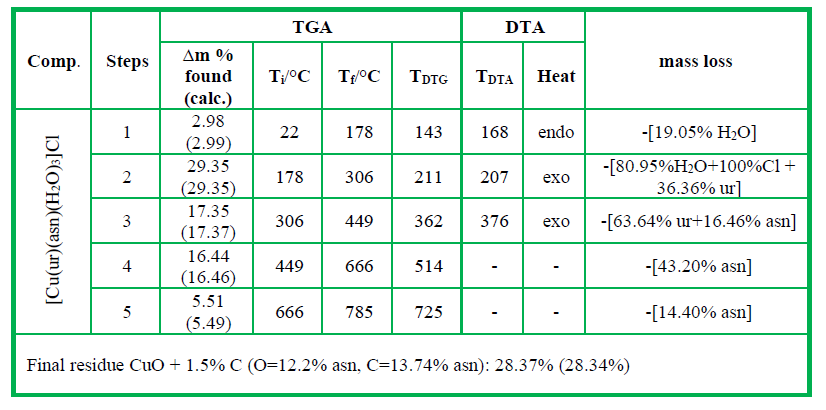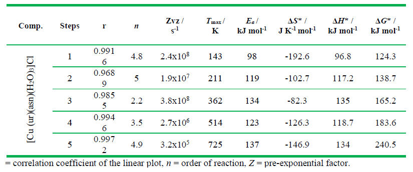 The TG and DTG curves of [Cu(ur)(asn)(H2O)3]Cl (Tables 8 and 9) and (Figures 11 and 12) show five steps of a continuous mass loss with DTG peaks indicating slow mass losses. The first step (22-178 °C) at TDTG 143 °C is attributed to the release of 19.05% of coordinated H2O (calc. 2.99%, found 2.98%). The remaining loss of H2O, and the loss of 100% Cl and 36.36% of urea occur in the second step (178-306 °C). Third (306-449 °C), fourth (449-666 °C) and fifth (666-785 °C) steps are due to the release of [63.64%ur+16.46%asn], [43.20%asn] and [14.40%asn] fragments (calc. 17.37%, found 17.35%; calc. 16.46%, found 16.44% and calc. 5.49%, found 5.51%), respectively, at the TDTG peaks at 362, 514 and 725 °C (Figure 9), respectively. The Ea calculated of these five steps are 98, 119, 134, 123 and 137 kJ mol-1, respectively, and the values of ΔS*, ΔH* and ΔG* are: -192.6, -102.7, -82.3, -126.3 and -146.9 J K-1 mol-1; 96.8, 117.2, 135.0, 118.7 and 134.0 kJ mol-1, and 124.3, 138.7, 165.2, 183.6 and 240.5 kJ mol-1, respectively, for the steps observed in the thermal decomposition of the complex.