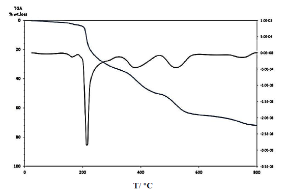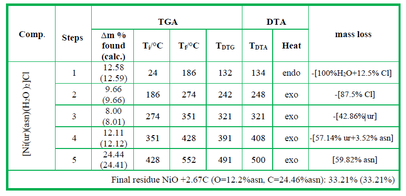 The thermolysis of [Ni(ur)(asn)(H2O)2]Cl (Tables 6 and 7) and (Figures 9 and 10) involves several successive steps at 24-186, 186-274, 274-351, 351-428 and 428-552 °C. The first step represents the elimination of 100% coordinated H2O molecules and 12.5% of a chloride atom (calc. 12.59%, found 12.58%) with activation energy Ea = 93 kJ mol-1 and a TDTG peak at 132 °C. The second step corresponds to the loss of the remaining 87.5% Cl atom (calc. 12.12%, found 12.11%) which has Ea of 124 kJ mol-1 with TDTG at 242 °C and exothermic peak TDTA at 248 °C. According to the DTG curve (Figure 8), the third step is assigned to the removal of 42.86% urea molecule (calc. 8.01%, found 8.00%) and with Ea and reaction order (n) of 114 kJ mol-1 and 0.1, respectively. The fourth step which corresponds to the loss of the remaining urea molecule and 3.52% of asparagine (calc. 12.12%, found 12.11%) has Ea = 129 kJ mol-1. The final step corresponds to the 59.82% loss of asparagine (calc. 24.41%, found 24.44%) with Ea = 131 kJ mol-1 and a TDTG peak at 491 °C. The final residue is NiO and carbon (2.67%) as ash (O=12.2%asn, C=24.46%asn) (calc. 33.21%, found 33.21%). The values of ΔS*, ΔH* and ΔG* are: -12.4, -117.9, -165, -120.4 and -144.5 J K-1 mol-1; 91.9, 122, 111.3, 125.7 and 126.9 kJ mol-1; and 93.5, 150.5, 164.3, 172.8 and 197.8 kJ mol-1, respectively, for the steps observed in the thermal decomposition of the complex.