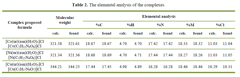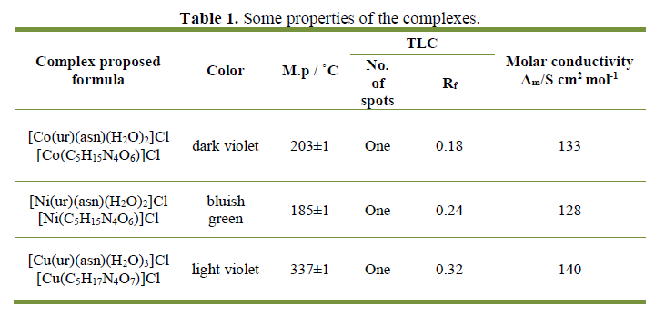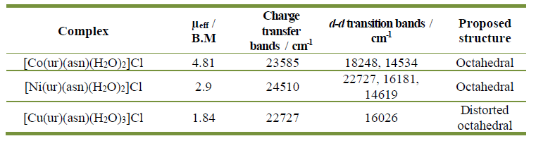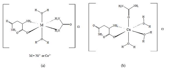 Complexes of Co(II), Ni(II) and Cu(II) with urea and asparagine are studied. Some physical properties, molar conductivity and analytical data are summarized in Tables 1 and 2. The elemental analysis proves that the complexes of Co(II), Ni(II) and Cu(II) with urea (ur) and asparagine (Aasn) ligands are of 1:1:1 (metal:ur:asn) molar ratio. The molar conductivity values indicate that the chloride anions are in the outer-sphere of these complexes.