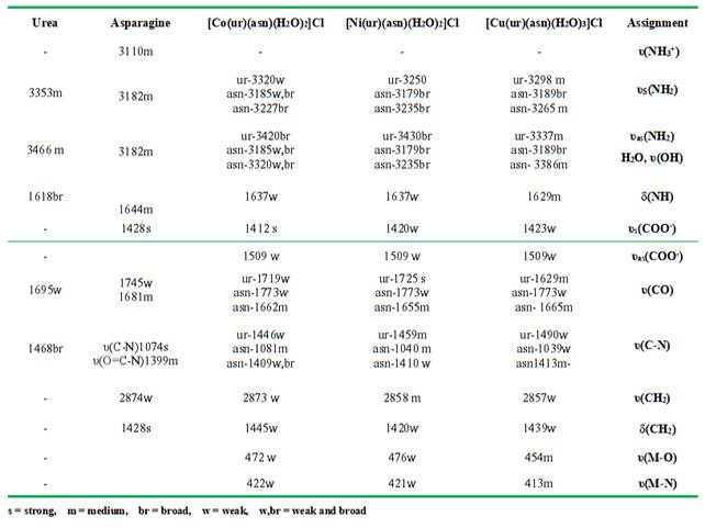 In these complexes, urea acts in two ways: as a monodentate ligand through oxygen of C=O, or as a bidentate through nitrogen of two NH2 groups, while asparagine acts as an anion bidentate molecule, through COO- group and NH2 group. The assignment of the distinctive bands is summarized in Table 3 and the IR spectra of complexes are shown in Figures 2, 3 and 4.