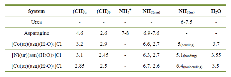 1HNMR spectra of [Co(ur)(asn)(H2O)2]Cl, [Ni(ur)(asn)(H2O)2]Cl and [Cu(ur)(asn)(H2O)3]Cl complexes show various signals which were summarized in Table 4. Urea shows a new signal at 5 and 5.1 ppm in Co(II) and Ni(II) complexes, respectively, for the amide groups coordinated to the metal atom without proton displacement22, while in Cu(II) complex only carbonyl group is coordinated to metal22. The signals at 3.2, 3.1 and 2.85 ppm are assigned to CH group, whereas signals at 2.9, 2.45 and 2.5 ppm of CH2 group are observed for Co(II), Ni(II) and Cu(II) complexes, respectively . The appearance of a new signal around 2.6-2.7 ppm is attributed to NH2 group of asparagine and the amide group shows signals in the range 6.3-6.7 ppm23. The coordinated H2O shows a new signal around 3.5-3.7 ppm24.