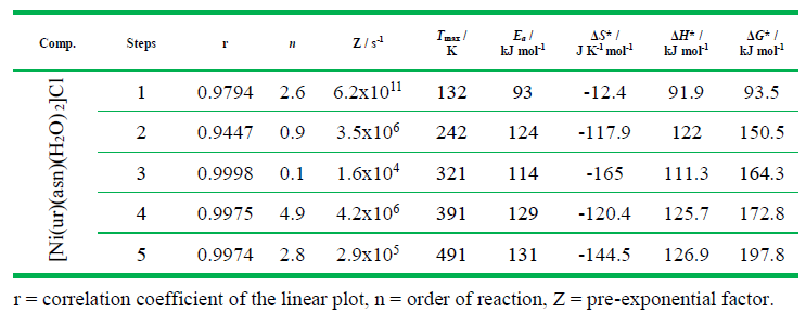 The characteristics of the thermal degradation of these two complexes recorded on the TG/DTG/DTA curves, their kinetics and thermodynamics parameters extracted from these curves are given in Tables 6-9.