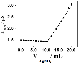 From graph of corrected conductance vs. volume of AgNO3 solution, the end point was obtained by the intersection of the straight-line segments, and thus determining the concentration of RAN-HCl.
