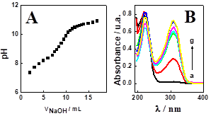 UV-vis spectrophotometric measurements were performed at different pH values in order to confirm the protonation of ranitidine molecule. Figure 3B shows UV-vis spectra where an increase in the absorption intensity at 310 nm with the increase of pH values can be observed. This behavior is attributed to protonation of RAN molecule which is majority form at pH values at least 2.0 units lower than pKa. These studies confirm that the conductometric titration was performed with RAN molecules in the protonated form.