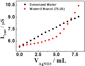 Aliquots of 10.0 mL or 5.0 mL (reference solutions or sample) were transferred to beakers and titrated with solutions of AgNO3 at the same concentration of the analyte (between 5.0 x 10-4 to 0.1 mol L-1) with additions of 0.5 mL or 1.0 mL. Conductance values were recorded 10 seconds after the titrant addition. Before plotting titration graphs, conductance values were corrected according to volume of titrant added (Equation 1), all titrations were conducted in temperature controlled at 20 ºC.