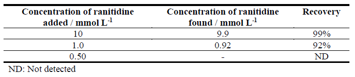 Pharmaceutical samples in tablet form containing ranitidine hydrochloride (RAN-HCl) were purchased in local drugstore. For each sample, twenty tablets were crushed using mortar and pistil and 50.0 mL of a stock solution with theoretical concentration of 1.0 mmol L-1 was prepared using deionized water or hydroalcoholic solution in different proportions of solvent.