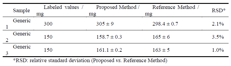 Comparative method used is described on Brazilian Pharmacopeia13 based on UV-Vis spectroscopy. A portion equivalent to one tablet was dissolved in water and after diluting to concentration around to 0.00125% (w/v). Standard solution was prepared at same concentration and the absorbance measurements of samples and standards solution were carry out at 314 nm using a quartz cuvette.