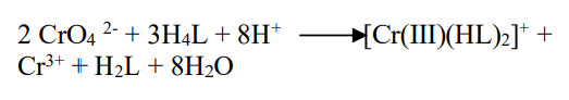 (1)The DPC (H4L) is oxidized to diphenylcarbazone (H2L), whereas Cr(VI) is reduced to Cr(III) forming the pink/violet color complex Cr(III) - diphenylcarbazone [Cr(III)(HL)2]+, the reaction occurs in acid medium and the complex has maximum absorbance at 540 nm.