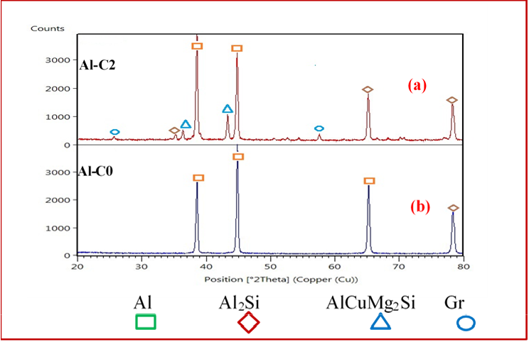 The X-ray diffraction analytic as given in Figure 4 manifests the XRD peaks of Al-Mg-Si-Cu-Ni matrix alloy with and without adding Garnet particles after applying the casting treatment processing. The XRD results for the stir casted Al-Mg-Cu-Si-Ni-9%Gr composite (Al-C2 sample), as presented in Figure 4a, exhibited many peaks which were alpha-Al, Al2Si, AlCuMg2Si as well the peak of garnet particles. The XRD peaks of the stir casted Al-Mg-Si-Cu-Ni matrix alloy (Al-C0) sample is presented in Figure 4b. The peaks of Al-C0 sample consisted of the alpha-Al and the high peak of Al2Si. The peak Al2Si was created due to the high dissolution percent of silicon within the Al matrix during the high temperature as results casting processing. Generally, it was observed that the cause of the presence of the Al2Si, AlCuMg2Si compounds implicit alloying elements (Mg, Si, Cu and others) dissolution within the aluminum matrix, due to high temperature during the heat process.