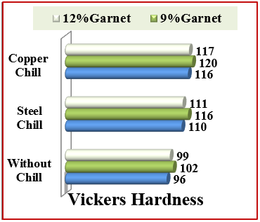 Vickers hardness values of the Al-Mg-Si matrix under the different chill casting conditions (in Figure 5). It was observed that Al-composite samples which have the highest Vickers hardness values were underwent the copper chill casting compared to mold steel chill and mold without chill. The recently studies16-18proved that the use copper chill end (in the casting process) was not only favors in the directional solidification but also enhances solidification. The rapid cooling rate was helping to get finer structures and improved mechanical properties as investigated in this study. It is seen that the casted Al-HMMC samples under copper chill has a significant increase of Vickers hardness value. The major reason for increasing of Vickers hardness due to the actions of mold copper chill end and also to the presence of garnet particles (Gr) were coherent grains and their uniform distribution within Al-matrix alloy composite samples.