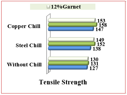 The ultimate tensile strength of Al-matrix composite samples under the different of mold-chills casting process shown in Figure 6. It was obvious that Al-composite with 9 wt.% garnet (using copper chill casting) has the high tensile strength. This high of tensile is due to increasing the weight percent of Gr. It was observed that tensile strength of Al-matrix composites reinforced with garnet is higher than the Al-matrix alloy without addition Gr particles. Recently studies by Nityanand and Prasad19 and Bandekar and Prasad20 referred to the advantages of the copper chill casting coupled with the reinforcement of Gr particles within Al-matrix alloy. However, the current study proved that copper chill casting condition with using Gr particles as reinforcement led to the very fine, uniform and coherent grains of microstructural (as aforementioned in Figure 2c) in addition to the obtaining improvements of mechanical properties of Al-matrix composites samples.