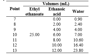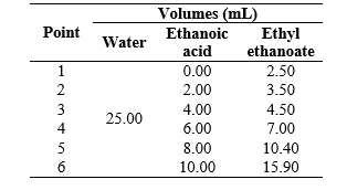 The liquid-liquid extraction process of ethanoic acid (C2H4O2) realized was modeled by the construction of a ternary phase diagram for the water/ethanoic acid/ethyl ethanoate system at room temperature (298.15 K) and atmospheric pressure (101325 Pa). Initially, six points of the binodal curve for the water-rich phase were created by titration with ethyl ethanoate using 25.00 mL of water and the volumes of 0.00; 2.00; 4.00; 6.00; 8.00, and 10.00 mL of ethanoic acid in each point. The volumes of ethyl ethanoate, required for the turbidity of the aqueous solution containing ethanoic acid, were experimentally obtained and presented in Table 1. Subsequently, more seven points were created for the ethyl ethanoate-rich phase. For this, 25.00 mL of ethyl ethanoate and 0.00; 2.00; 4.00; 6.00; 8.00, 10.00 and 12.00 mL of ethanoic acid were used. The water expenses volumes were presented in Table 2.