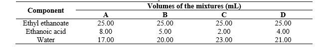 The distribution coefficients (D) and the separation factors (S) for mixtures A, B, C, and D were calculated to evaluate the efficacy of extraction of ethanoic acid by the organic solvent (ethyl ethanoate) by Equation 2. The separation factor, which is a measure of the ability of a solvent to separate a solute from water, was defined as the ratio between the ethanoic acid (D2) and water (D1) distribution coefficients, respectively. The experimental values of the distribution coefficients and separation factors, for each mixture of the ternary system, were listed in Table 7.