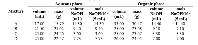 Four mixtures (A, B, C, and D) were prepared using the volumes of water, ethanoic acid, and ethyl ethanoate described in Table 3. The preparation of each them was realized with magnetic agitation for 10 minutes at room temperature (298.15 K). Then, each mixture was submitted to one stage of extraction, compound by contact and separation. The ternary systems were made in contact by vigorous agitation in a separation funnel of 60.0 mL and were kept in repose for 5 minutes. The aqueous and organic phases were separated for a posterior measure of mass and volume. Aliquots of 5.00 mL of each phase were titrated with sodium hydroxide solution (NaOH) 1 mol L-1 using 3,3-bis(4-hydroxyphenyl)-2-benzofuran-1-one (C20H14O4) as the indicator. The volumes of NaOH expensed in each titration were presented in Table 4.