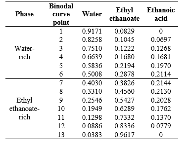 The equilibrium compositions in the binodal curve (in mass fraction) for each component of the water/ethanoic acid/ethyl ethanoate system at 298.15 K and 101325 Pa were given in Table 5. The same results were plotted in Figure 1. The area of the biphasic liquid region obtained results from the mutual solubility of the solute (ethanoic acid) in the aqueous and organic solvent (ethyl ethanoate).