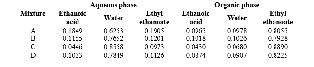 The organic solvent chosen was found to have shown satisfactory separation factors (i.e. > 1), indicating its ability to extract ethanoic acid from water. The results demonstrated that the separation factor decreases in the order of the mixtures C > D > B > A. For the ternary system, increasing the ethanoic acid content in the mixtures decreased the separating ability of ethyl ethanoate. The ethanoic acid distribution coefficients showed values higher than the water distribution coefficients, suggesting a higher preference of the solute to be distributed in the organic phase than in the aqueous phase.