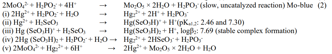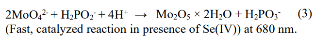 PMA was used as a redox indicator because of its ability to produce a product such as Mo-blue, which has a characteristic absorption effect on the visible region when reduced. Reduction of PMA in the presence of hypophosphite in acidic medium at room temperature is very slow. However, Se(IV) at trace levels activates selectively the catalytic effect of Hg(II) ions in acidic medium at 70 °C. This can be explained by the stable complex formation of Se(IV) in the catalytic cycle of Hg(II) ions in the acidic medium. According to Pearson’s acid-base theory, Hg(II), which is soft Lewis acid, will interact with the soft base Se(IV) to form Hg-Se bond. The rate increase observed in the catalytic behavior of Hg(II) in the presence of trace Se(IV) was spectrophotometrically monitored at 680 nm. The catalytic reaction mechanism, based on the expected activation, can be predicted as follows: