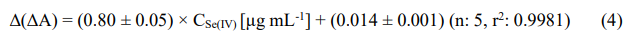 Monitoring the net absorbance change according to optimal reagent conditions, different Se(IV) standard calibration solutions for Δ(ΔA) = (ΔAC-ΔA0) were sampled. The results show that the analytical signal against the concentration of Se(IV) in the range of 0.0125-1.0 μg mL-1, Δ(ΔA), lies in a sufficiently wide linear range with a regression coefficient of 0.9981 in Fig. 8. In this calibration interval the least squares equation is as follows: