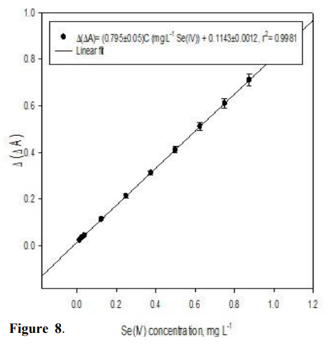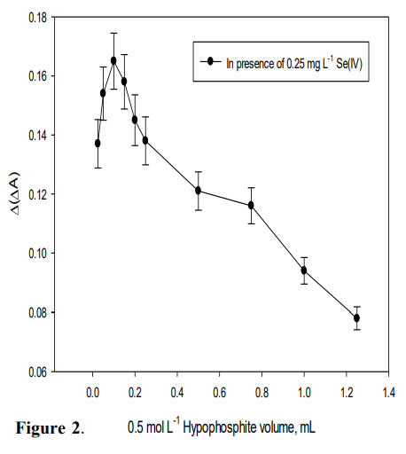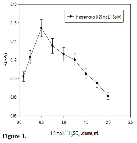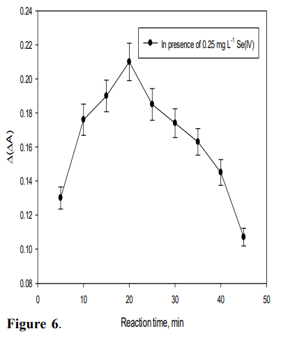 The effect of reaction variables (acidity, concentration of reactants, temperature, time, and ionic strength of the medium) on the net reaction rate was extensively evaluated and optimized by monitoring each variable at a certain interval by keeping all other variables constant, based on optimization tool which is also well-known as univariate approach. In fact, in which there is not an interaction between variables, this approach is simpler, easy to use, more reliable, and moreover does not require an expert user (herein, a mathematician or statistician, which can statistically use multivariate models in optimization step) in his/her area to determine whether or not a variable is significant, and to establish relationships between variables as only one variable is used each time to obtain results. The optimum values of the variables for triplicate measurements of selenium at fixed concentration of 0.25 mg L-1 were determined to obtain the minimum detection limit and maximum sensitivity at each determination. The results were represented as error bars showing the mean and standard deviation of each replicate measurement sets in all figures.