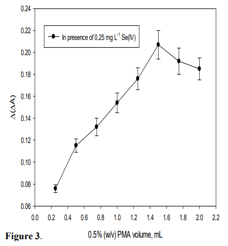 The effect of PMA volume on sensitivity was investigated in the range of 0.25-2.0 mL of 0.5% (w/v) in Fig. 3. The sensitivity for the fixed time of 20 min at 70 °C was plotted versus its volume, by keeping the other reagent concentrations constant at 680 nm, and the maximum sensitivity was observed to be 1.5 mL. In low volumes, sensitivity has increased up to 1.5 mL, while in higher volumes the slope gradually declines with a decreasing slope. This decrease in sensitivity is due to the fact that the noncatalytic reaction rate is faster than the catalytic reaction. High sensitivity at low volumes can be explained by the fact that the activation power of Se(IV) is more effective. Therefore, a PMA volume of 1.5 mL was considered as optimal for further studies.