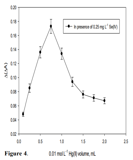The effect of Hg(II) volume on sensitivity was examined in the range of 0.1-2.0 mL of 0.01 mol L- 1. The sensitivity for the fixed time of 20 min at 70 °C was plotted versus Hg(II) volume in Fig. 4, by keeping the other reagent concentrations constant at 680 nm, and the maximum sensitivity was observed to be 0.75 mL. Sensitivity increased up to 0.75 mL at low volumes with increasing slope, declined with a decreasing slope in range of 0.75-1.5 mL, and remained constant in range of 1.5-2.0 mL. This decrease in sensitivity may be due to the fact that the non-catalytic reaction rate is faster than the catalytic reaction. Another explanation is that after the Hg(II)-complex formed in the presence of Se(IV) is reduced to Hg(I)-complex by hypophosphite, the reduced complex or Hg22+ ions can be converted to metallic Hg and Hg(II) by disproportionation. High sensitivity at low concentrations can be explained by the fact that the activation power of Se(IV) is more effective. Therefore, an Hg(II) volume of 0.75 mL was considered as optimal for further studies.