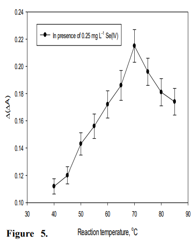 The effect of acidity on the sensitivity, which is a measure of the rate difference between catalytic and noncatalytic reactions, was investigated in the range of 0.1-2.0 mL of 1.5 mol L-1 H2SO4. The sensitivity, Δ(ΔA), for the fixed-time of first 20 min at 70 °C in Fig. 1 was plotted against the volume of acid by keeping other reagent concentrations constant, and the maximum sensitivity was observed to be 0.5 mL. Sensitivity decreases at lower and higher acid volumes. This high acidity also indicates that the rate of the un-catalyzed reaction is more effective than the catalyzed reaction. At low concentrations, the activation power of Se(IV) may not be effective enough. As a result, 0.5 mL of 1.5 mol L-1 H2SO4 concentration was considered to be sufficient for further studies.