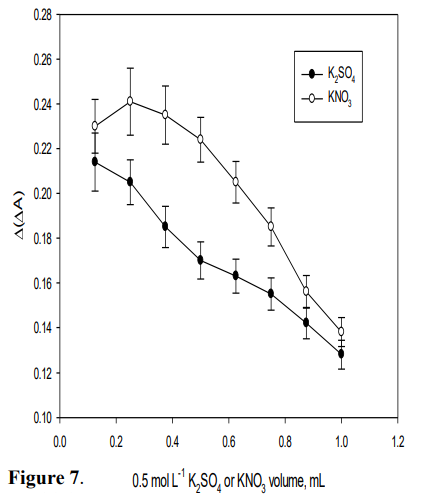 The effect of ionic strength on the catalyzed and uncatalyzed reaction was investigated in the volume range of 0.1-1.0 mL of 0.5 mol L-1 KNO3 and K2SO4 solutions in Fig.7. In the presence of KNO3, at low volumes up to 0.5 mL, the sensitivity did not change, but it began to decline with increasing slope at higher volumes. However, even at low volumes in the presence of K2SO4, it was observed that the sensitivity decreased with increasing slope. This indicates that the ionic strength of the environment should be controlled in real complex specimens with high ionic strength. Another solution is to conduct sample analysis with a standard addition calibration curve based on the addition of the known standards of Se(IV).