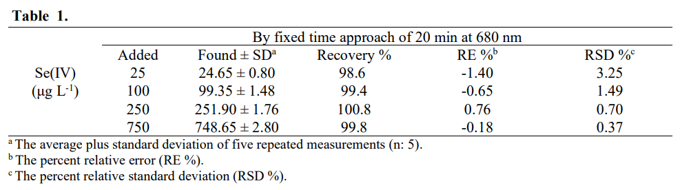 The limits of detection and quantification of the present kinetic method (LOD and LOQ) was calculated by taking 3- and 10-folds of the standard deviation of the signal for the ten replicate measurements of the blank solution without analyte, and found to be 3.6 and 12 μg L-1, respectively. Five replicate measurements were performed for different concentrations ranging from 0.0125 to 1.0 μg mL-1 and the percent recovery, relative error (RE) and relative standard deviation (RSD) values were found by substituting the analytical signals at the calibration equation. The detailed information is presented in Table 1. From the results, it can be stated that the proposed method is accurate and precise.