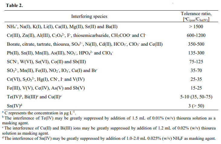 To determine the selectivity of the kinetic method against interferents, the effect of possible interfering species on the rate of catalytic reaction was investigated by changing the concentration of interfering ions to keep the concentration of Se(IV) constant at 250 μg L-1 in Table 2. The tolerance limit has been defined as the concentration of interfering species that does not cause more than ± 5.0% of relative error. The results are summarized in detail in Table 2. They indicate that all other interfering species, except for Te(IV), Bi(III), Cu(II) and Sn(IV) ions, do not significantly affect the analytical signal when selenium at the level of 250 μg L-1 was determined in a final volume of 10 mL under optimum reagent conditions. The effect of the Te(IV), Cu(II) and Bi(III) ions has been increased to a tolerance ratio ranging from 35 to 70 with addition of thiourea. The interference of Sn(IV) was improved to a tolerance ratio of 50-fold with the addition of NH4F. Similar errors resulting from positive and negative interactions between analyte and matrix in real samples can be minimized by using the calibration curve approach based on spiking at three concentration levels around quantification limit.