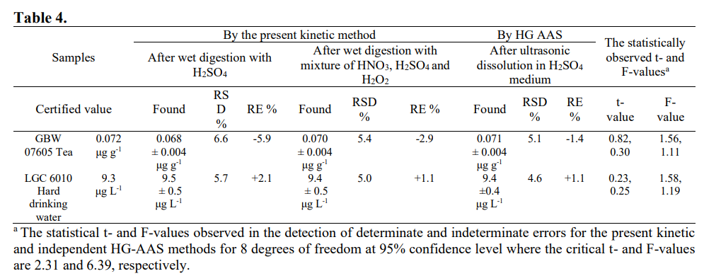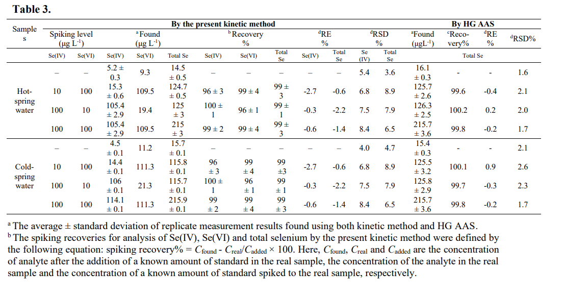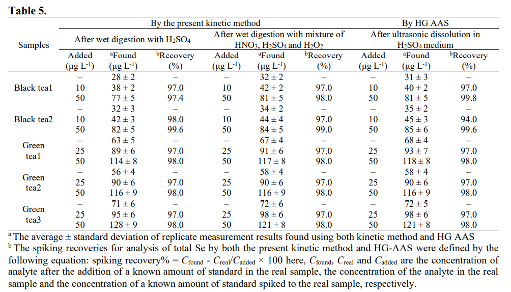 At initial, the method was applied to samples taken from hot- and cold-spring waters after submitting to certain pretreatments. Samples were treated by using directly kinetic method for analysis of Se(IV). Then, for total selenium analysis, samples were treated by boiling with 4.0-5.0 mol L-1 HCl at 85-90 °C for 30 min, for prereduction of Se(VI) to Se(IV). The total Se contents of samples were calculated from the difference between total Se and free Se(IV) amounts obtained by using the kinetic method with and without prereduction. To ensure the accuracy and precision of the method, total selenium levels were also monitored after conversion to hydride with NaBH4 in HCl medium after acidification. From the results obtained by both methods in Table 3, it can be concluded that the current method is as accurate and precision as the routine HG AAS method.