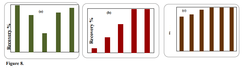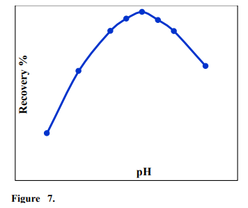 The solution pH is one important parameter that can effect on metal ion adsorption. In order to figure out of pH effect on Pb(II) adsorption, variety of pH were studied in the range 3.0 to 8.0. For prevention from sedimentation, increasing pH not continued and the results are illustrated in Fig. 7. The results show that with the increase of pH to 6.0, percent recovery continually increased and then decreased. Probably the pH effects on functional groups of IIP or the chemistry of Pb2+ ions. At lower pH than 6.0 and presence of higher concentration of H+, the active sites of the MIIP become protonated and their abilities for interaction with Pb(II) decreased. By increasing pH more than 6.0, Pb2+ ions can react by hydroxyl groups and the adsorption process would be decreased.