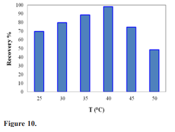 In IIP techniques temperature has a noticeable effect on the adsorption behavior and analyte recovery. The effect of equilibrium temperature on the extraction behavior of Pb(II) on MIIP was shown in Fig. 10. As shown by increasing temperature from 25 to 40 °C, the recovery yield is increased thermodynamically. It can be seen that Pb(II) extraction in the range of 40 to 50 °C drastically decreased. This manner may be related to swelling of polymer. Probably in elevated temperature the size and geometry of cavities will be changed and could not be suitable for adsorption of Pb2+ as target ions.